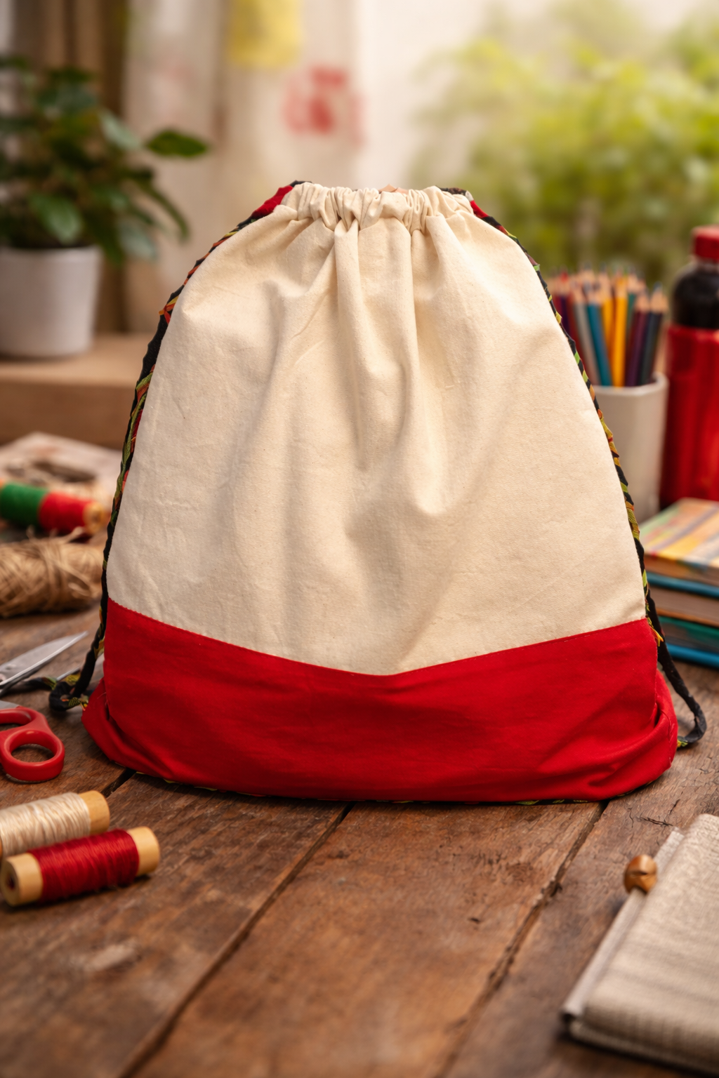 Praktisk gympapåse i slitstark bomull, naturfärgad med röd botten. Dragskostängning upptill håller innehållet på plats. Påsen är perfekt för skola, förskola eller fritidsaktiviteter. Välj namn…