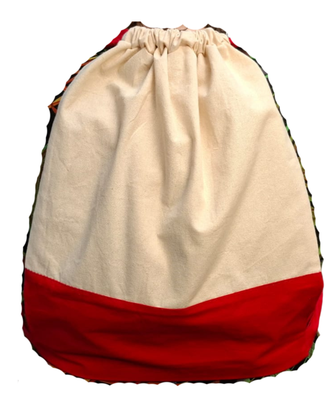 Praktisk gympapåse i slitstark bomull, naturfärgad med röd botten. Dragskostängning upptill håller innehållet på plats.