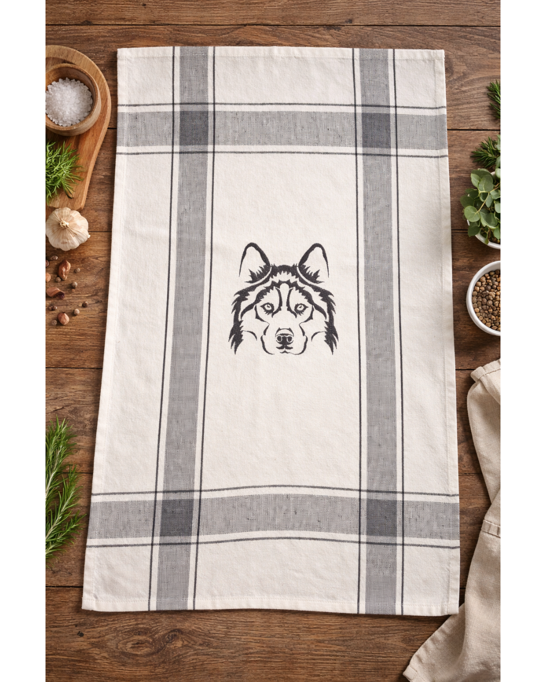 Kökshandduk från märket Noble House med broderat husky porträt.