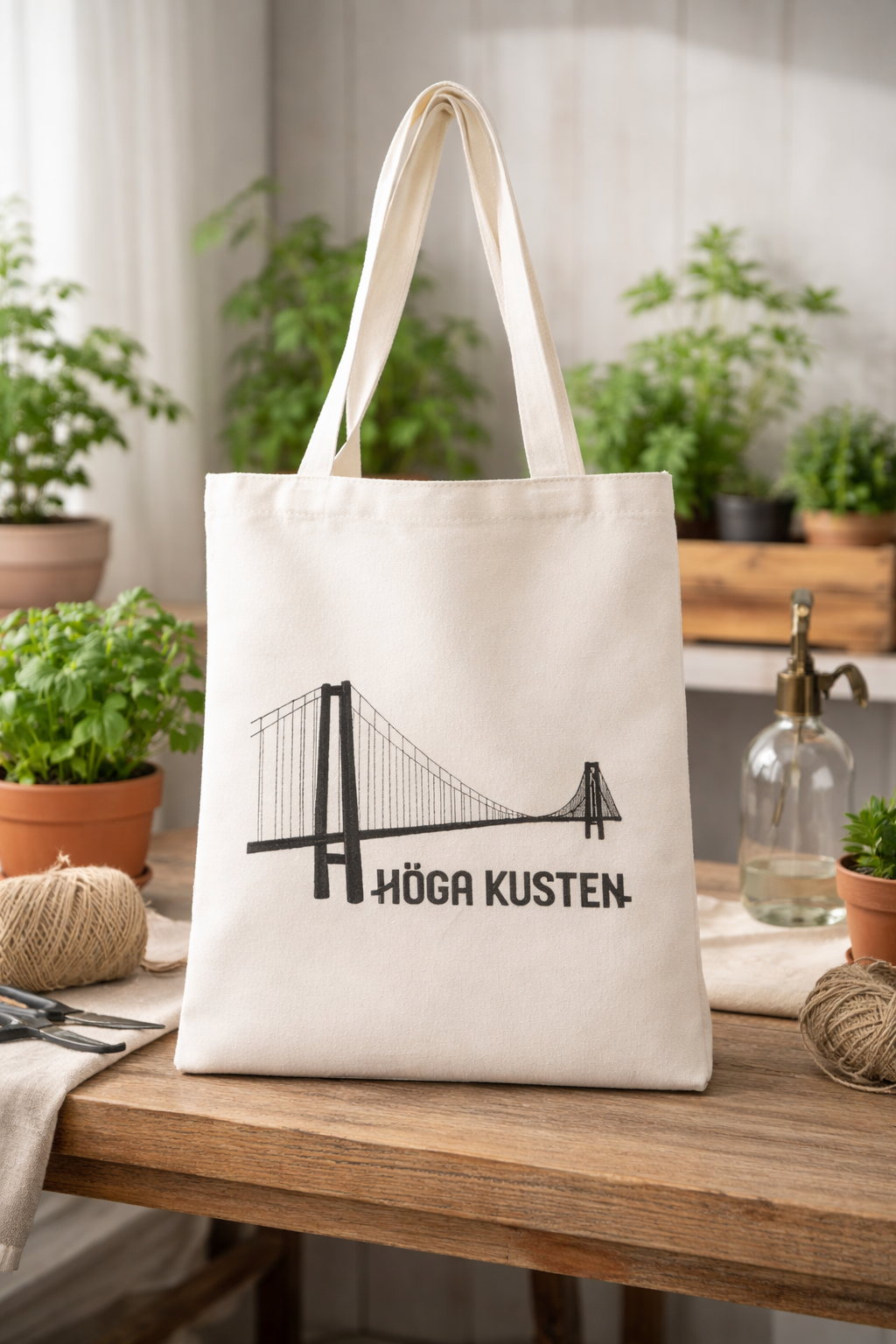 Denna canvasväska med broderi av Höga Kusten Bron är en stilren och hållbar tygväska inspirerad av den unika naturen i Höga Kusten, Västernorrland. Det detaljerade broderiet ger väskan ett exklusivt och genuint hantverksuttryck som skiljer sig från tryckta motiv.